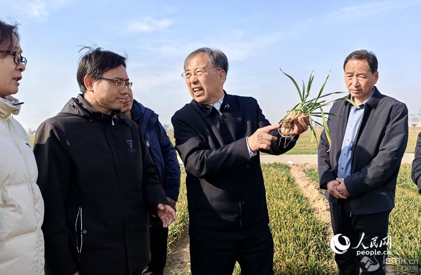 茹振鋼與他的學生及當?shù)胤N糧大戶交流麥苗生長情況。人民網 宋芳鑫攝