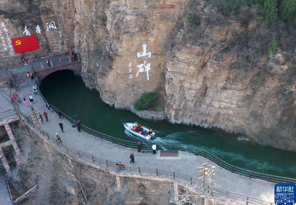 2025年3月18日拍攝的紅旗渠紀(jì)念碑。新華社記者 李嘉南 攝 紅旗渠青年洞旁 鐫刻著“山碑”二字的石壁巍峨聳立 吸引著幾乎每一位游客駐足凝望