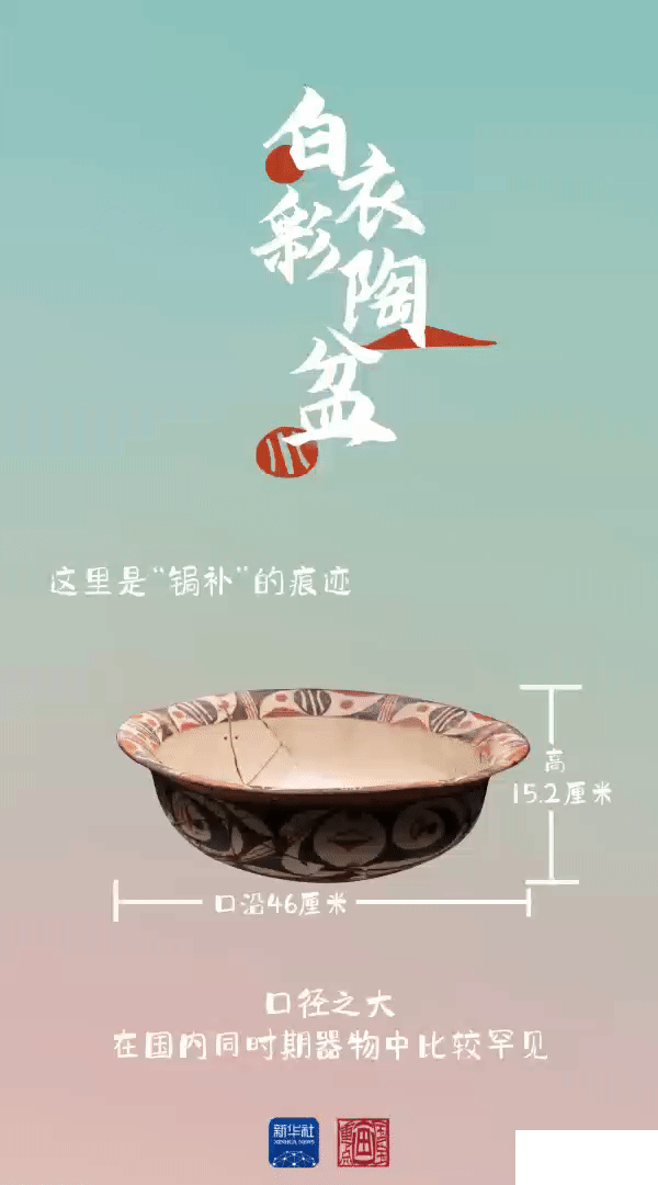 這件白衣彩陶盆 口沿、腹部均飾以成組的、對稱的圖案 可以看出大河村先民 在繪制陶器紋飾時 就已經(jīng)采用對稱等分的手法 值得一提的是 該彩陶盆近口沿處有兩對鉆孔 專家推測,這是先民們 用繩索穿孔并固定以修補器物 說明在仰韶文化時期 已經(jīng)有“鋦補”這一工藝