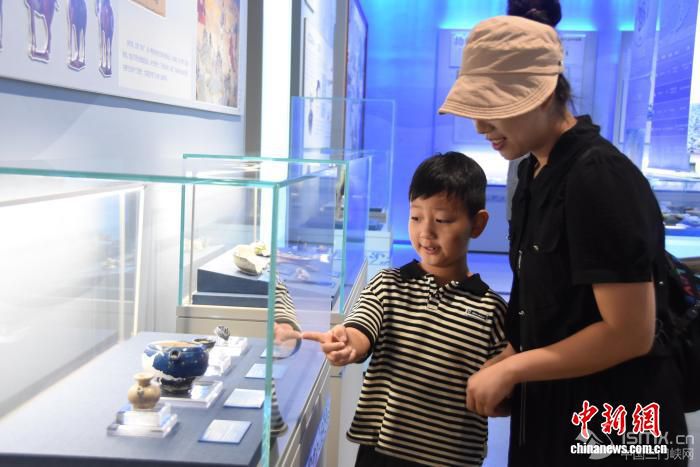 ![]() 8月13日,在位于河南鄭州的河南南水北調(diào)博物館內(nèi),國(guó)內(nèi)首次唐代青花瓷專題展“絲路華章——唐代青花瓷瑰寶展”吸引眾多游客參觀。圖為家長(zhǎng)帶孩子參觀唐代青花瓷。 王宇 攝