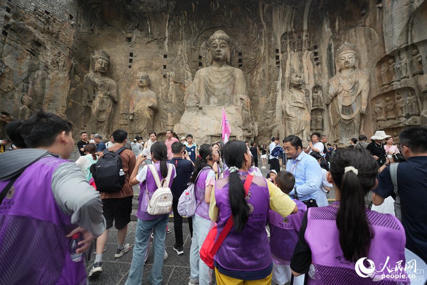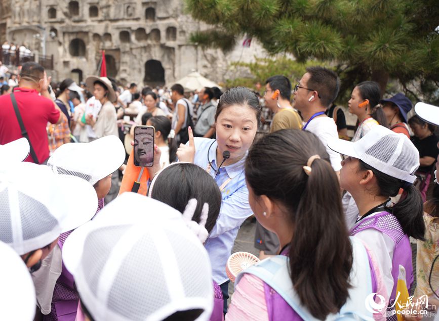 孩子們在聽導(dǎo)游講解。人民網(wǎng)記者 王佩攝 8月的伊河畔,暑氣蒸騰,龍門石窟的奉先寺前卻涌動著青春的熱潮。一群學(xué)生正圍著講解員,仰頭凝視盧舍那大佛的微笑,聽她講述武則天捐資造像的歷史傳奇。“佛像的衣紋線條像流水一樣,唐代工匠的審美真的太棒了!”來自鄭州的中學(xué)生李雨桐的驚嘆聲,道出了這個夏天無數(shù)青少年在龍門石窟研學(xué)的共同感受。