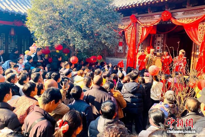 2月17日,農(nóng)歷正月初一,被譽為“微短劇之村”河南登封袁橋古村吸引眾多游客前來打卡體驗。據(jù)了解,自2024年以來,已有超過50部微短劇在此取景拍攝。圖為“員外招婿”表演吸引游客圍觀。 劉楊迪 攝